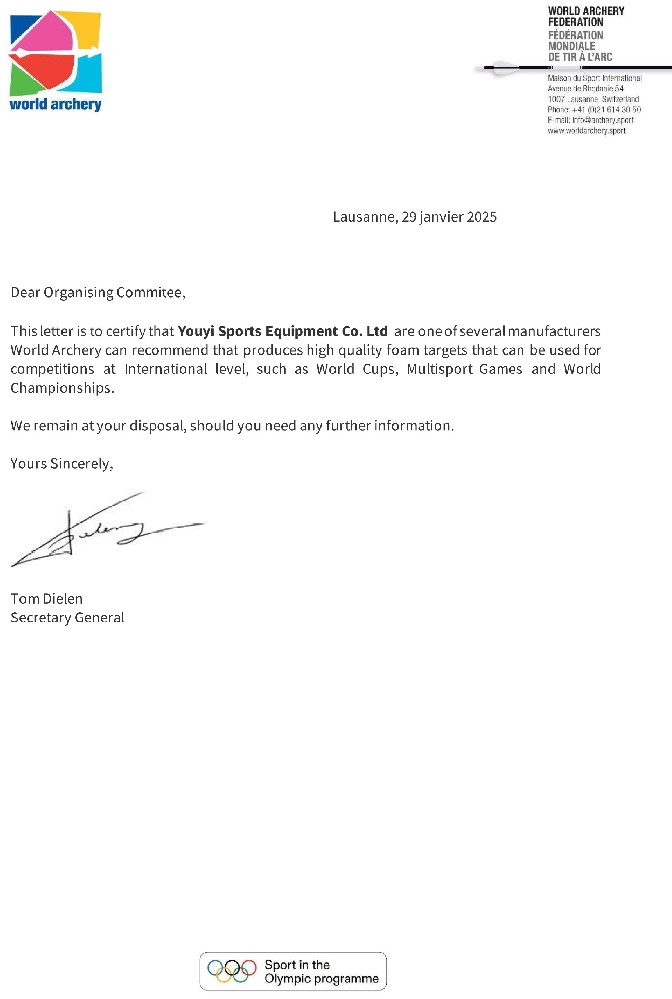 公司自主生產的器材先后成為2008年北京奧運會、2010年廣州亞運會、2011年深圳世界大學生運動會、2014年南京青奧會、2021年成都世界大學生運動會、2022年杭州亞運會等世界知名賽事射箭器材供應商。